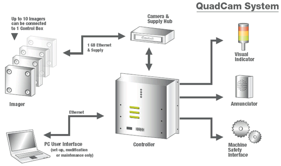 QuadCam 能快速并很容易的达到你的精确的安全要求, 使用“即插即用”装置,使得安装简单快洁。 每个成像仪能保护8’X10’区域。 随着您的生产线的扩展,可以很简单地把成像仪加到其他系统中。您可以操作多达10个成像仪,相当于只用一个控制器,即可产生10个成像仪。