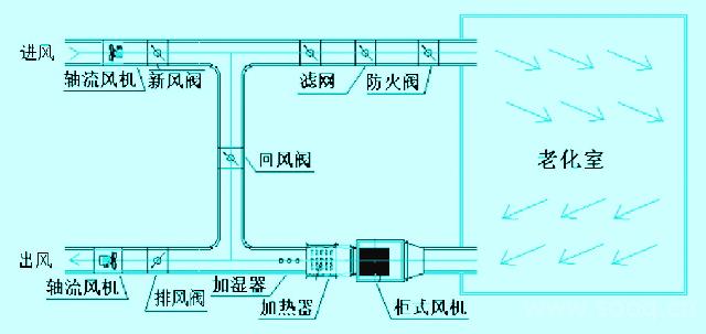 在正常情况下(温湿度),关闭进风阀和排风阀,停止进风电机和排风电机,打开回风阀和防火阀,启动回风风机,保持老化房内回风循环。