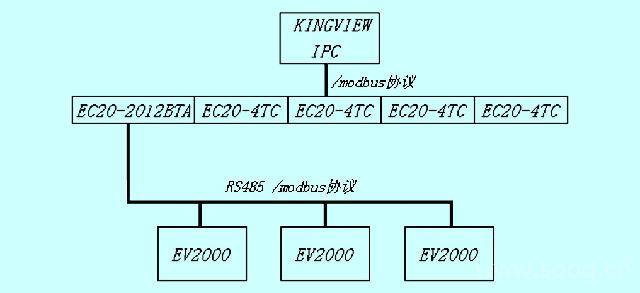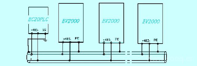 由于EMESON EC20 PLC和EV2000变频器(非标)都集成MODBUS协议,所以实现它们的通信相对比较简单,整个网络采用RS-485通信方式。