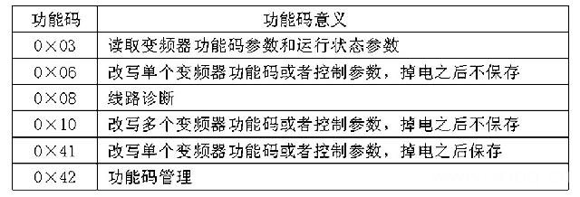 Modbus最主要的功能是读写参数,不同的功能码决定不同的操作请求。变频器Modbus协议支持表3功能码操作: