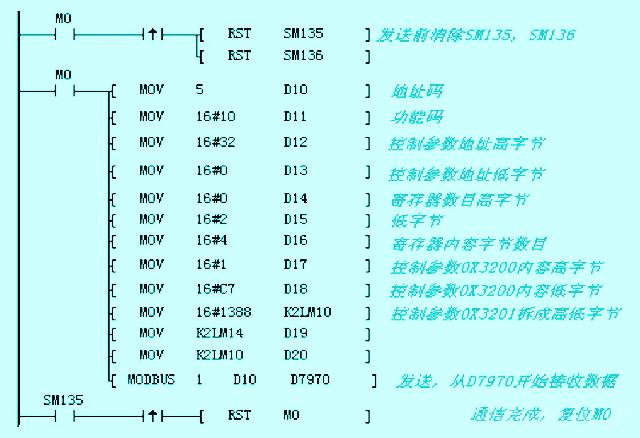 (5) 具体程序编写:启动5#变频器正转,转速设定为50.00Hz(内部表示为5000)的命令如表8、表9、表10所示。