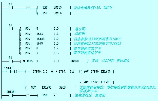 其次,在程序里调用PID指令和PWM指令用于控制Y0的输出(对SV和PV的比较而进行的逻辑控制输出较简单,故此处省略)。参见图7。