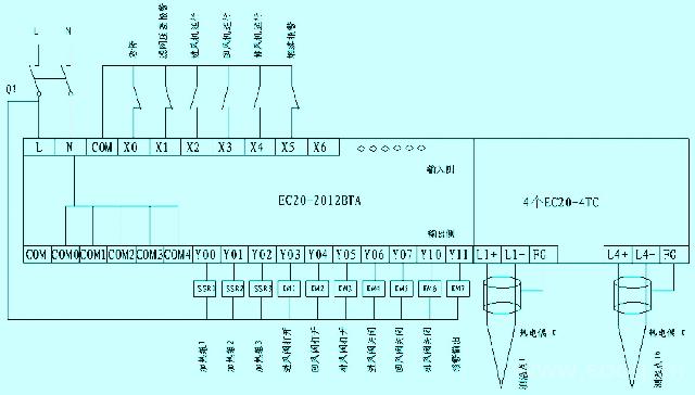 根据老化房工艺要求组成如上图控制系统:上位机采用台湾研华IPC(工控计算机);监控画面采用亚控公司的KINGVIEW软件,该软件操作简单,元件形象丰富,性能稳定;核心控制部分采用艾默生EC20-2012BTA类型的PLC和4个温度采集模块(EC20-4TC,接受K型温度信号);传动采用艾默生EV2000通用型变频器。