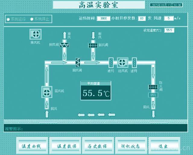 主画面如图4所示,主要完成对系统状态的监控(如各种风阀的开闭状态,风机的运行状态,报警状态),数据统计(如系统运行的时间,启停系统的次数),温度设定/测量等功能。