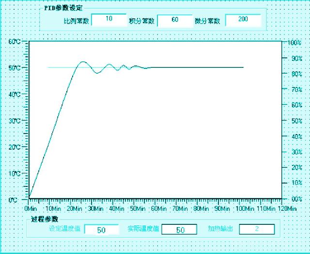 PID参数设定画面主要用于比例常数P,积分常数I,微分常数D的设定,同时根据实时温度曲线状况进行调节;同时显示PID控制的输出比例,见图6。