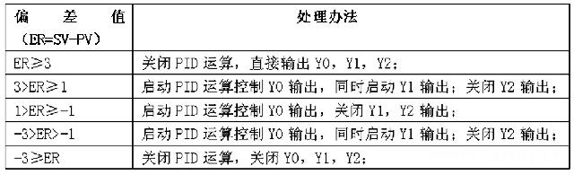 为便于对整个老化房内温度的控制,同时充分利用EC20 PLC自身PID功能和PWM脉冲输出(Y0,Y1)的优势,室内温度区域分为2个部分(上层和下层各8个测温度点),对温度取平均值作为温度的测量值,并把此平均值送入PID功能块进行运算,同时对加热执行元件(参考EC20 PLC的I/O接线图,固态继电器SSR1,SSR2,SSR3所控制的发热管的功率逐渐加大)也进行了分组处理:温度偏差较小的情况下,进行PID运算,通过Y0输出脉冲给SSR1,同时关闭SSR2,SSR3(即Y1,Y2停止输出);如果温度偏差较大,则Y1,Y2也参加输出,具体处理思路如下: