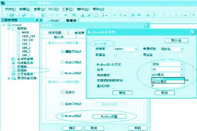 在设备连接方面,EC20 PLC充分体现了自身的优势,由于EC20 PLC本身带有2个串行通信口(1个RS-232口,集成自由协议/编程协议/MODBUS从站协议,1个RS-232/485口,集成自由协议/MODBUS主站/从站协议),EC20 PLC利用COM0口和IPC进行通信(EC20 PLC做从站,设置成MODBUS从站协议),利用COM1和多台变频器组成网络进行集中控制(EC20 PLC的COM1设置成MODBUS主站协议)。
