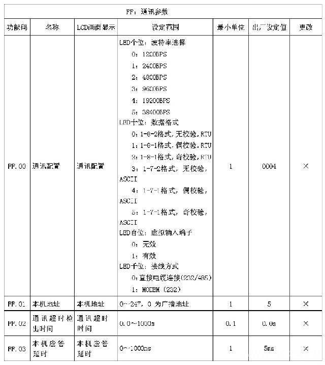 例如变频器功能码参数F3.02的寄存器地址为0×302,变频器功能码参数FF.01的寄存器地址为0×F01。