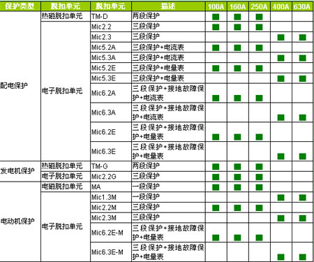 ■ 脱扣单元:TM, Mic2.2, Mic2.3, Mic5.2A, Mic5.3A, Mic5.2E, Mic5.3E, Mic6.2A, Mic6.3A, Mic6.2E, Mic6.3E, MA, 1.3M, Mic6.2E-M, Mic6.3E-M, Mic2.2G等。