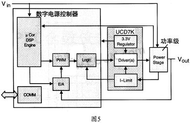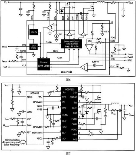 图7为应用UCD7230数字控制同步压降与数字脉宽调制控制器UCD9112相接构成数字转换器示意框图。它反映了新型数字脉宽调制控制器UCD9112需要具备智能型集成MOSFET驱动器的UCD7230支持。