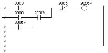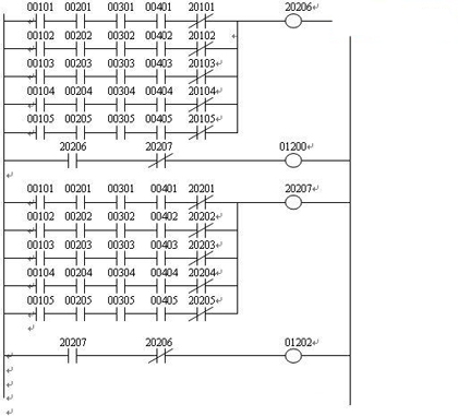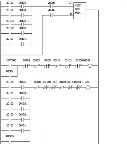 该电路与电梯的控制不同,在立体车库的轿内和门厅呼叫电路中,轿内呼叫按钮置于载重箱内操作箱上,平时不使用,只有在需要维修或者司机需要进入指定库区位时,才起用,方便人员操作。门厅的控制只有一个,置于车库库门入口处,功能与轿内呼叫电路完全相同。因为车辆的入库操作都在库门入口处进行,其他库层无操作按钮。但载重箱移到指定层并平层后,自动起动横向左或右移动电动机,将载车活动板推入指定位置(A区或C区)并锁住,而电梯的每层都有上呼和下呼按钮,这些按钮的响应都是执行先上后下的原则,并且保留没有响应的呼叫,这就需要根据集选控制的要求设计呼叫指令。综上所述,可以把轿内和门厅呼叫电路合并起来,只有一个电路实现控制功能。00001、00003、00005、00007、00009分别为1-5层A区呼叫按钮,00002、00004、00006、00008、00010分别为1-5层C区呼叫按钮,控制梯形图如下图所示。