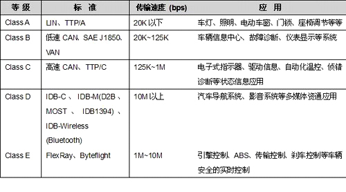 为避免线缆带来的各种麻烦,车载网络(In-Vehicle Network)中应用标准化总线技术则成为较理想的解决方式。按不同的技术特点和应用领域,车载总线技术可分为五类。如表一所示,第一类LIN、TTP/A等总线传输速度最低,适用于车体控制;第二类中速总线,如低速CAN、SAE J1850、VAN(Vehicle Area Network)等,适用于对实时性要求不高的通信应用;第三类包括高速CAN、TTP/C等技术,适用于高速、实时死循环控制的多路传输网络;第四类如IDB-C、IDB-M(D2B、MOST、IDB1394))、IDB-Wireless(Bluetooth)等,一般应用于车载资通娱乐网络;第五类传输速度最高,用于最具关键性、实时性最高的人身安全系统,包括FlexRay和Byteflight等。