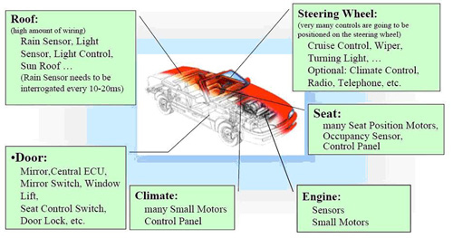 汽车中的电子系统和组件平均达到80多个,它们之间越来越复杂的连接和通信功能对总线技术提出了需求。车灯、发动机、电磁阀、空调等设备的传统连接方式为线缆连接,而如果电子元件之间也用电缆连接则必然造成连接复杂性的提高、可靠性的下降,和整体重量的上升;此外,伴随而来的线缆的磨损和老化现象也将使汽车的安全性能降低。