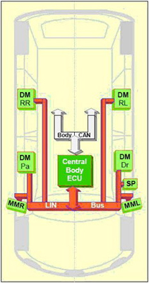 以汽车门控系统举例。如图四所示,目前中高档车型的门控系统主要包括车门锁(Lock)、防盗门锁(Dead Lock Latch)、动力车窗(Power Window)、踏脚灯(Footstep light),及切换面板照明(Switch Panel Illumination)等。其主节点为一个与车体CAN网络相连的中央车体控制单元(Central Body ECU),每个车门都有一个车门模块,即按四门的车身则为DM-Driver(司机位置)、DM-Passenger(副驾驶位置)、DM-RearRight(右后门)和DM-RearLeft(左后门)提供门锁和动力车窗等功能;另外两个前门还有MMR和MML左右后视镜控制模块。驾驶端的中央切换面板(Central Switch Panel)是一个独立的从节点,控制所有的动力车窗、手动门锁及后视镜等功能。