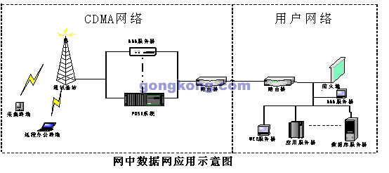CDMA网络和用户网络之间可以采用专线链接,也可以使用Internet链接。使用Internet链接必须考虑安全性,因此,可以使用VPN将二者利用Internet链接起来。