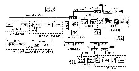 根据以上特点,本系统选用OMRON的中小型PLC对各工艺段或设备分散控制,通过OMRON Protocol和Controller Link组成网络,各工艺段控制室和中控室设置上位机,构建人机界面进行生产管理和对生产数据进行后续处理。全厂控制网络如图2所示。