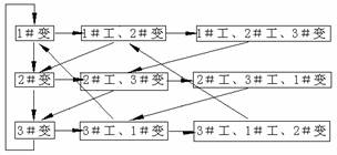 泵组切换示意图如图2,工作条件满足,开始工作时,1#泵变频启动,泵的转速随变频器输出频率的上升而逐渐升高,如变频器的频率达到50HZ而此时水压还未达到设定值,PLC内置的程序控制使得切换到下一个工作步,延时一段时间后,1#泵迅速切换至工频运行,同时解除变频器运行信号,使变频器频率降为0HZ,然后2#泵变频启动,若压力仍未达到,则2#泵切换至工频,3#泵变频启动,在运行中始终保持一台泵变频运行,当压力达到设定值时变频输出将为0HZ,同时PLC通过I/O端口跳到下一个工步,由PLC决定切除1#工频泵,此时由一台工频泵和一台变频泵运行,如果此时压力达到设定值,变频器的输出为0HZ,再切换到下一个工步,PLC解除2#工频泵,只由3#泵变频运行来维持管网压力。当压力下降,变频器频率升至50HZ输出信号,延时后3#泵切换为工频,1#泵变频启动,若压力仍不满足则1#变切换为1#工,2#泵变频运行,如果压力仍达不到,2#变切换为2#工,启动3#变,三台泵同时工作以保证供水要求。