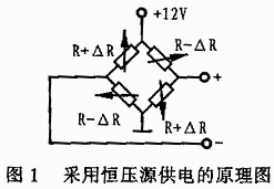 MPX2100是一种压阻式压力传感器,在硅基片上用扩散工艺制成4个电阻阻值相等的应变元件构成惠斯顿电桥。电桥有恒压源供电和恒流源供电两种供电方式。采用恒压源供电的原理图如图1所示。