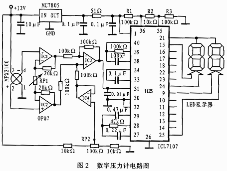 MPX2100构成的数字压力计如图2所示。MPX2100的工作电压为12V,传感器4脚和2脚之间输出的压力信号送到IC1、IC2进行放大,放大器的增益为1+40/RP1,IC1、IC2接成同相输入阻态,可以获得仪器放大器所需的高输入阻抗;IC3是一个单位增益的差动放大器,通过它可以获得较高的CMRR,IC4和RP2分压电路构成调零电路,RP1用来调节放大器电路的增益,以完成满量程压力时的显示数字校准。IC3输出的电压加在A/D转换器IC5的模拟电压输入端(31脚),并由IC5转换成数字量以驱动LED显示器显示压力的大小。