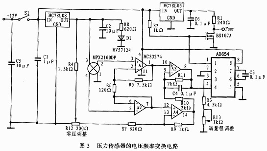 图3所示是由MPX2100构成的电压频率变换电路。该电路由放大和电压频率变换两部分组成,并由一个4运放和一些电阻组成放大电路,它具有高差模增益和高共模抑制比,而且输入阻抗高,可以调整电路的偏置。电路的差模放大主要由A1完成,A2用来防止运放的反馈电路流入传感器的负端。在零压力时,传感器的2脚和4脚之间的电压之差为零。如果2脚和4脚的共模电压各为4V(传感器电源电压的一半),则A1的1脚电压也是4V,这样,该电压经A3和A4路即可使其输出为零压力电压。输出端的零压力偏置由R4和R12引入,调节R12可以设置偏置电压。通过R7可选择从13脚看过去的阻抗,通常为1kΩ。放大器增益AV=R5[1+(R11/R10)>/R6=125。选择增益为125可使传感器的满量程输出摆幅在32mV时放大到4V的摆幅。