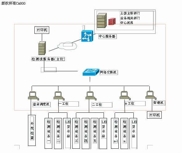 计算机联网检测系统以检测线服务器为中心构成检测站局域网实现线内资源共享,同时与上级主管部门及相关业务部门连成广域网,以实现信息的共享与职能的监管。目前常用的网络结构为星型拓朴结构,网络操作系统多采用Windows 2000 Server,而数据库平台则常见Oracle、Microsoft SQL Server2000等大型关系数据库。