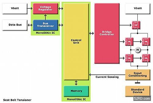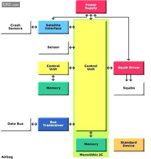 我们以目前普遍安装在车上的安全气囊(Airbag)系统来剖析这样的架构。安全气囊的组成单元包括位于车体外的冲撞感测器(satellite sensor),建置于前座、后座、车门、头部上方等各个地方的加速度感测器(g-sensor),电子控制单元,以及安全气囊等。当车体受到冲撞时,冲撞感测器能够在数个微秒的时间内高速将此突变状况告知电子控制单元(通常是16位元或32位元的微控制器),此控制器会立即根据碰撞的严重程度、乘客的重量、座椅/安全带的位置等参数资料,以及其他偏佈于全车厢的安全系统感测器所传回的资料,立即进行运算评估,并在最短的时间内透过电爆驱动器(squib driver)来启动安全气囊。