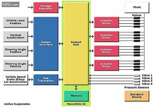 以主动式悬吊系统来说,它结合了气压/油压/感应式减震筒、电脑控制系统与感应器等装置,能够依照车速/加速、负重、左右G力、转向程度等数据的变化,自动按照电脑控制程式的设定来即时调整悬吊系数,同时也能调整车辆与地面的高度,大大提升了车辆的操控特性。主动式悬吊的系统架构,请参考(图三)。