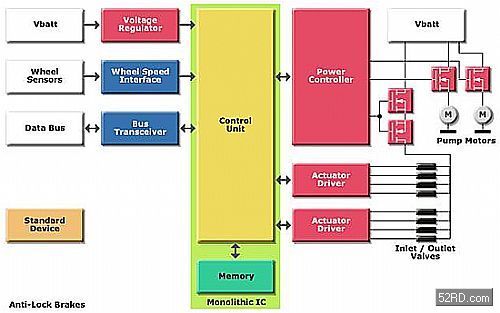 今日的ABS需要采用更高可靠性的电子元件来确保其操控安全性,而随着更多国家制定出相关的法规要求,也让ABS的设计复杂度更为提升。在ABS系统的关键单元是输胎转速的感测,当控制单元发现紧急煞车导致转速过低时,会适时重新给予足够的输胎滚动空间。其目的是赋与输胎更大的抓地力,以免造成失速滑行的危险状况。ABS的系统架构,请参考(图四)。