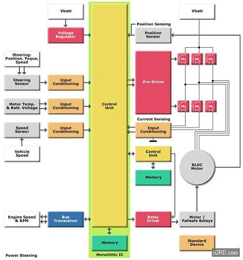 动力方向盘的全名是电子式动力辅助方向盘(Electric Power Assisted Steering, EPAS)系统,它在过去几年中已开始获得市场的接受。相较于传统的油压式方向盘,动力方向盘采用电子式的马达来为驾驶人提供方向性的控制辅助,同时能降低引擎的负载,进而能改善燃料的使用效益。一般的动力方向盘系统会利用感测器得知方向盘的位置、转力矩(Toque)、速度,车子的速度,以及马达温度及电池供电电压等状况,再进一步做出电子式马达的辅助控制,请参考(图五)。