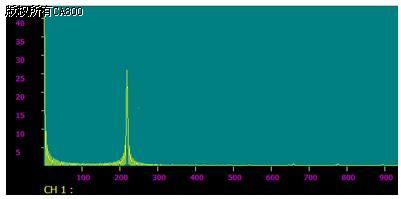 在增调整已经很理想的情况下,开始安装工件试切。在试切过程发现一个很异常的现象,即在x轴以0.3rpm速度进给时,y轴的追踪误差会有一个不断的跳变,当时y轴根本没有信号输入,是不应该有任何移动的。出现这样的情况只有两种可能,一是有信号干扰,二是发生了机械振动!通过判断是在x轴以一定速度移动时,y轴会有共振产生!利用我们调试软件ASDA_A_SW找到共振频率,消除共振,调试完成。共振抑制频率点的抓取如图3所示。