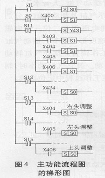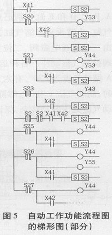 图4为主功能流程图的梯形图,图5为自动工作功能流程图的梯形图(只给出了一部分) 。先看步25到步27的单序列,其各步的控制规律为:若某步为活动时,则当它与下步间的转换条件一旦成立,该步即变为非活动步,而下一步成为活动步。当步为活动时,相应的动作和命令才执行,非活动步相应的动作和命令不被执行。这样步25是活动步时,会发右头快进指令(使Y442得电) ,直到快进到位(行程开关SQ4受压,转换条件X412满足) ,步25成为非活动步,右头停止快进(使Y442失电) ,步26成为活动步,工件开始从中位降下位(使Y447、Y552得电) ⋯⋯。选择序列各步的控制规律为:分支时,若一个前级步是活动的,则当它与多个选择后续步之间的哪个转换条件满足,哪个后续步就成为活动步,而前级步成为非活动步。合并时,若多个选择前级步之一是活动的,当该活动步与一个后续步之间的转换条件满足,则后续步就成为活动步,前级步成为非活动步。实例中步11为活动步时,四个分支的转换条件哪个成立则哪个分支步就会成为活动步。如果按动自动加工起动按钮,使转换条件X403满足,则会进入步12,开始自动加工过程,直到转换条件X424满足,分支合并循环到初始步,开始一个新的轮回。按照控制要求,整个加工过程中主泵电机需要一直处于运转状态,所以在步11中使用了置位Y430指令,而在步11成为非活动步后, Y430并不失电。并行序列各步的控制规律为:分支时,若一个前级步是活动的,则当转换条件满足,则多个并行的后续步同时成为活动步,而前级步成为非活动步。合并时,若多个并行的前级步均是活动的,当转换条件满足,则一个后续步成为活动步,多个并行的前级步同步成为非活动的。实例中步20为活动步时,执行装件指令,装件完毕,转换条件X425满足,步21、步23同时成为活动步,即停止装件,开始工件上位降中位和主轴定位动作。由于这两个动作不同时结束,因此插入了两个没有动作和命令的空步——步22、步24 (梯形图中相应的步进接点没有连接输出继电器) ,用于分别停止两个前级步,结束相应的动作,并等待两个动作均停止的时刻,一旦时刻来到(条件X410·X427满足) ,两并行步合并转换到步25。三头同时加工时,也有类似的同步问题,在此不再赘述。