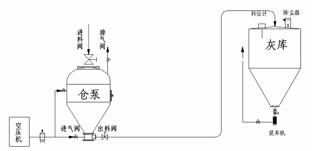 火力发电厂输灰流程:电除尘器灰斗→锁气器→斜槽→饲料机→仓泵→灰库→灰场,而从除尘器灰斗至灰库部分具体输灰程序为:首先在仓泵泵体内无压力的情况下,打开进料阀和放气阀(有仓泵导电除尘器灰斗,以保证仓泵内空气的排放)、启动锁气器,把电除灰尘灰斗内的灰料经锁气器→斜槽→饲料机→进料阀送入仓泵内,当泵内的灰料到达一定的程度时,停止锁气器运转,关闭进料、放气器两阀,打开出料阀,再开进风阀,利用压缩空气将泵内的灰料通过输灰管道至灰塔。然后再进行料放气,周而复始,完成将电除尘器分离出的灰送至灰库塔的任务。该系统在整个生产过程中具有重要的作用,正常运行时能确保锅炉燃煤烧后产生的灰粉及时的输送出去。
