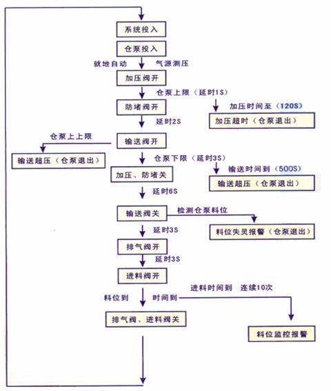 在仓泵输灰控制过程中有大量连锁及闭锁。如:①在仓泵体仍有余压得情况下就只能开放气阀降压而禁止开进料阀,进料和放气两阀未完全关闭时则禁止打开进风阀,以防止返灰;②在灰管压力较允许值高时则闭锁打开出料阀和进风阀,以防灰管堵塞或堵塞故障变大;③在空气母管压力较低时闭锁打开进风阀,防止堵管;④在进风阀未完全关闭时,闭锁大开放气阀和进料阀;⑤当仓泵内的灰料高度已达到预定位置、同侧的另一台仓泵不再出料状态且空气母管压力已达到规定值时,连锁打开出料计进风阀进行出料;当空气母管压力降到规定值后,连锁关闭进风、出料阀,停止出料;另外还者有阀门故障检测系统,当一阀门从全关位置到全开位置或从全开位置到全关位置的动作时间超过一定时间值时,则发出声报警信号,提醒运行人员,该阀门已卡,应立即进行处理。