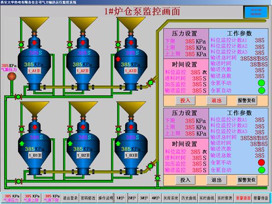 仓泵系统中对其压力、时间、料位等参数进行监控,并可以手动设置工艺参数,对设备进行相应控制,系统共对4个机组的仓泵进行监控,画面中还包括限值报警状态等信息。