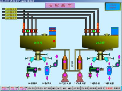 灰库监控系统中对2个灰库进行监控,灰库系统中的监控设备有管道切换阀、灰库料位计、加热器、搅拌机、散装机以及气化风机。画面中每个管道中有切换阀,其状态清晰的反映了现场阀位信号,并可以由工作人员进行操作。灰库中安装了先进技术的射频导纳料位传感器,可以准确地将灰位信号传给PLC进而显示在组态画面中,可以使工作人员清楚地分析灰位情况。