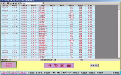 * 系统报警功能:系统具有完善的报警功能,在设备监控画面中用不同的颜色代表状态,模拟量设有限值报警,开关量设置状态转换报警,并专门设置总报警一览画面,如图7所示,显示所有的报警状态以及相关信息。系统配有语音报警,可以进行语音提示,方便的为工作人员提供了报警信息,即使对事故进行相应的处理。报警可以进行存储以备事故追忆提供依据。