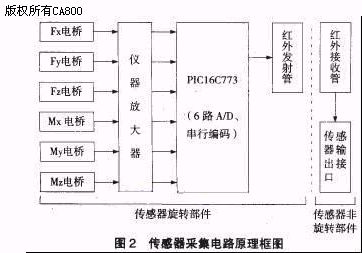 16C773完成六维信号的采集, 并由单片机将六维力采集值编码封装为包含数据包头尾字节和校验字节的固定长度( 14 字节) 的串行数据包, 经16C773 的UART口, 以19200( 或更高) 的波特率向外单路输出。车轮传感器随车轮一起转动, 六维力数据包需经非接触传输方式输出至非旋转部分, 本系统采用红外传输信号耦合方式。UART 输出的串行码, 驱动安装于内侧轮车轴线位置的红外发射管, 而接收管安装于外侧轮车轴线位置, 中心对准发射管, 内外侧轮发生相对转动, 不影响串行码的发射接收, 从而实现了数据包的非接触传输。