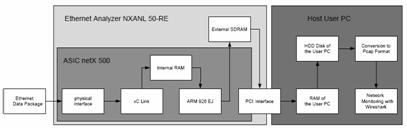 以太网报文由物理接口传送至netANALYZER,通过xC Link将报文和状态信息、时间戳、长度、报文错误等信息一同传送至netX芯片的RAM区中,报文由已经存储在flash中的实时以太网协议固件,根据不同实时以太网协议报文格式进行打包,由ARM核处理后传送至netX芯片外部SDRAM中,从而完成报文数据的抓取打包过程。