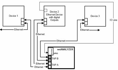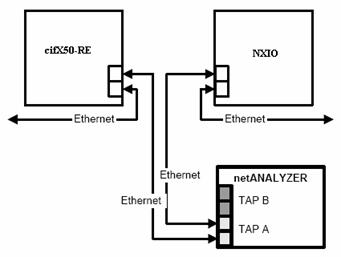 不同的硬件连接方式所测试的数据,可分析实时以太网设备的不同性能和参数,(具体参考德国赫优讯netANALYZER产品应用手册),本文采用其中一种连接方式,netANALYZER的连接如图3,此连接方式可以分析错误报文、循环周期、时间抖动等信息。