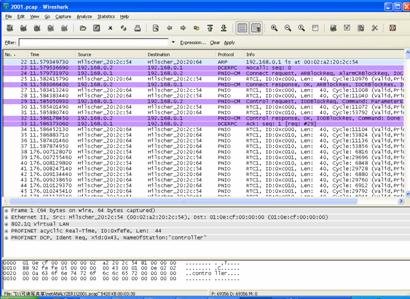 本论文正是基于上述关键问题,在深入分析德国赫优讯最新推出的实时以太网分析仪netANALYZER的基础上,利用赫优讯cifX50-RE实时以太网主站板卡,赫优讯实时以太网从站IO测试板NXIO,搭建PROFINET实时以太网网络通讯平台,通过netANALYZER网络分析仪抓取实时以太网报文,结合Wireshark网络报文分析工具,对PROFINET网络性能进行研究,对PROFINET产品性能进行分析。