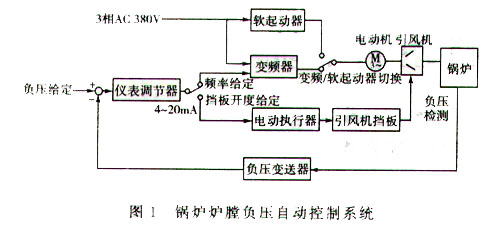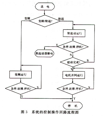 ![]() 通常情况下采用变频运行方式,在变频运行时, K 1 、 K 2 触点吸合,软起动主回路触点 K 3 、 K 4 和旁路主回路触点断开。在变频运行时,引风机入口挡板全开,负压调节系统自动控制变频器的输出频率来调节电机的转速,达到对负压的控制。如果变频器出现暂时无法恢复的故障时,可通过“变频—软起” 选择开关,选“软起”运行方式,在电机软起动过程中, K 3 、 K 4 吸合, K 1 、 K 2 、 K 5 断开,电机降压起动,以减少对电网和机械设备的冲击,电机软起动完成后, K 5 吸合, K 1 ~ K 4 断开,电机自动转投接电网保持恒速运行,变频器频率给定信号作为电动执行器开度给定控制信号,炉膛负压的控制通过调整引风机入口挡板调节供风量来实现。 该系统的控制操作回路流程图如图 3 所示。