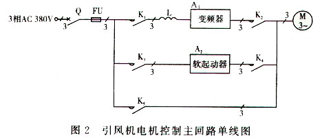 ![]() 图 1 中,炉膛负压给定由仪表调节器面板设定,同炉内负压检测和变送器检测到的负压实际值比较,经仪表调节器 PI 运算后输出 4 ~ 20mA 电信号,作为变频器频率给定信号,用于变频器控制电机转速,达到自动控制风量的目的。如果变频器出现故障,可切换到软起动运行方式,这时的频率给定信号就作为电动执行器的控制信号,通过控制引风挡板的开度,达到对引风量的控制。这种设备方案既保证了风机变频调速运行,满足负压自动调节的稳定性和运行的经济性,又能保证一旦变频器出现故障仍能保证运行的可靠性。 引风机电机控制主回路单线图如图 2 所示。
