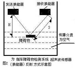 倒车检测障碍糸统超声换能器的工作方式为反射式,,即发送传感器换能器发射40KHz频率的超声波,迂到障碍后反射被接收传感器的换能器接收并转换成电信号,见图2所示.