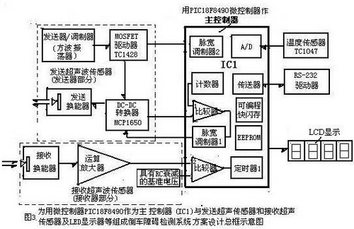 设计方案包括:IC1主控器-为用Microchip的 PIC l8F8490微控制器作为汽车倒车障碍检测系统的主控器;发送部份(即发送超声波传感器)与接收部份(即接收超声波传感器);温度传感器(TC1047A)、通信接口RS-232驱动器以及与LCD或LED显示器等外围电路组成。