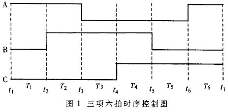 矩角特性是步进电机运行时一个很重要的参数,矩角特性好,步进电机启动转矩就大,运行不易失步。改善矩角特性一般通过增加步进电机的运行拍数来实现。三相六拍比三相二拍的矩角特性好一倍,因此在很多情况下,三相步进电机采用三相六拍运行方式。三相步进电机工作在三相六拍运行方式时,每个状态的变化使电机转动1/6齿距,三相激励规律为A-AB-B-BC-C-CA共六拍,对应时序如图1所示。A、B、C分别代表接到三相步进电机A相、B相、C相绕组的驱动脉冲。