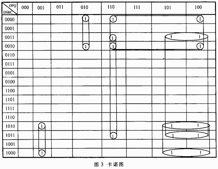 以O为例,由状态真值表可得其卡诺图,如图3所示。根据圈数和最小项可得其逻辑表达式为: