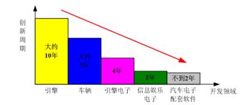(4)开发时间短。尽量缩短新车型新产品的研发时间是汽车设计者和制造商追求的目标之一。图中显示出在汽车电子产品方面的新技术研发周期是非常短的。这就要求汽车电子技术的研发需要有方便快捷的开发平台,并且在技术研发上有延续性和可复用性,尽量缩短开发时间。特别是在车载汽车电子装置的研发中,因为它们与汽车本身的性能无关,所以更可以不受到整车其它部分研发进展的约束,需要在尽量短的时间内开发出适合需要的产品。