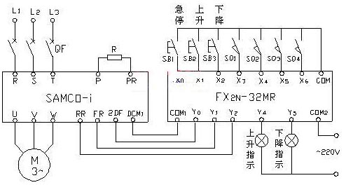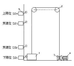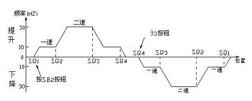 图中QF为断路器,具有隔离、过电流、欠电压等保护作用。急停按钮SB1、上升按钮SB2、下降按钮SB3根据操作方便可安装在底部和顶部,或者两地都安装,操作时,只需按下SB2或SB3,系统就可自动实现程序控制。