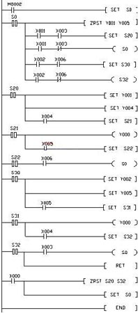 PLC控制一方面代替继电线路,另一方面,对于系统所要求的提升和下降、以及由限位开关获取吊笼运行的位置信息,通过PLC内部程序的处理后,在Y0~Y2 端输出相应的“0”、“1”信号来控制变频器输入端子2DF、FR、RR的状态,使变频器及时按图2所示输出相应的频率,从而控制升降机的运行特性。速度档由2DF选择,每档速度的大小则通过对变频器进行功能预置设定,再通过PLC的程序来控制频率切换。当PLC输出端Y0Y1Y2的状态为“010”时,变频器输出一速频率,升降机以10HZ对应的转速上升,当为“110”状态时,变频器输出二速频率,升降机以30HZ对应的转速上升;相应的,当Y0Y1Y2的状态为“001”、“101”时,升降机分别以10HZ、30HZ对应的转速下降。
