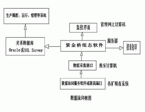 本系统实施共分为三块:开发已有控制系统数据采集接口、组建实时数据库和用户组态三个部分。系统网络图和数据流图如下所示: